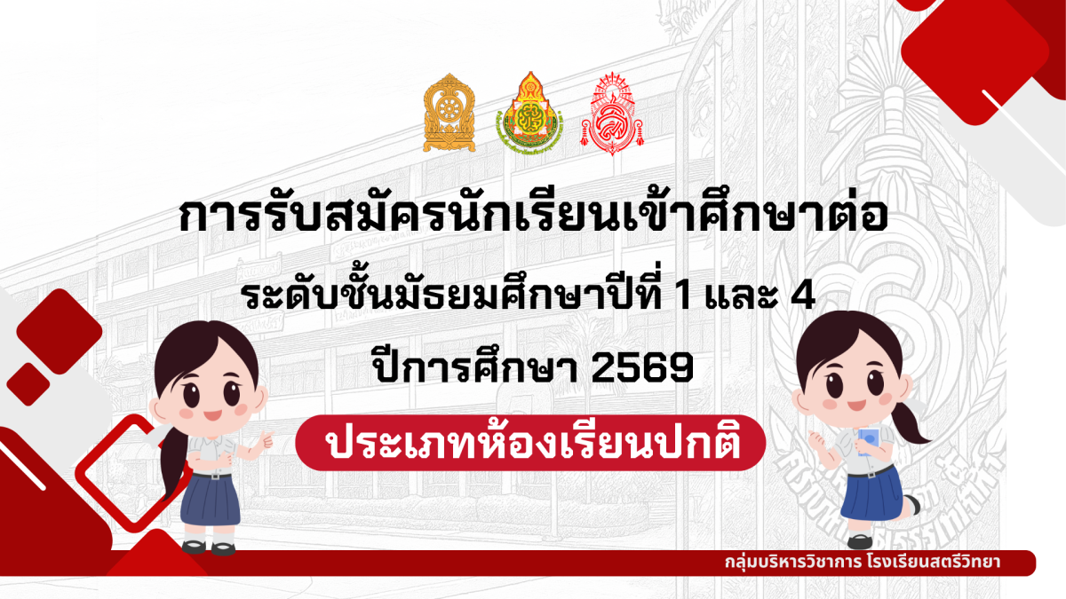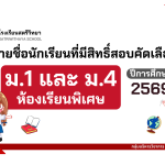 ประกาศรายชื่อผู้มีสิทธิ์สอบ ประเภทห้องเรียนพิเศษ ม.1 และ ม.4February 17, 2026 February 17, 2026 Categories ข่าวประชาสัมพันธ์โรงเรียน Tags [17-02-2569] ประกาศรับสมัครนักเรียน ระดับชั้น ม. 1 ห้องเรียนปกติ [17-02-2569] เกณฑ์การคัดเลือกนักเรียนความสามารถพิเศษ ม. 1 (ด้านภาษาไทย) [17-02-2569] เกณฑ์การคัดเลือกนักเรียนความสามารถพิเศษ ม.1 (ด้านกีฬา) [17-02-2569] เกณฑ์การคัดเลือกนักเรียนความสามารถพิเศษ ม.1 (ด้านดนตรีไทย) [17-02-2569] เกณฑ์การคัดเลือกนักเรียนความสามารถพิเศษ ม.1 (ด้านวงโยธวาทิต) [17-02-2569] เกณฑ์การคัดเลือกนักเรียนความสามารถพิเศษ ม.1 (ด้านทัศนศิลป์) [17-02-2569] เกณฑ์การคัดเลือกนักเรียนความสามารถพิเศษ ม.1 (ด้านนาฏศิลป์) [17-02-2569] เกณฑ์คัดเลือกนักเรียนความสามารถพิเศษ ม.1 (ด้านคุณธรรมจริยธรรม) [17-02-2569] หนังสือรับรองการอาศัยอยู่จริง [17-02-2569] ประกาศรับสมัครนักเรียน ระดับชั้น ม. 4 ห้องเรียนปกติ [17-02-2569] เกณฑ์การคัดเลือกนักเรียนความสามารถพิเศษ ม. 4 (ด้านภาษาไทย) [17-02-2569] เกณฑ์การคัดเลือกนักเรียนความสามารถพิเศษ ม. 4 (ด้านกีฬา) [17-02-2569] เอกสารรับรองความสามารถพิเศษ [17-02-2569] เกณฑ์การคัดเลือกนักเรียนความสามารถพิเศษ ม. 4 (ด้านวงโยธวาทิต) [17-02-2569] เกณฑ์การคัดเลือกนักเรียนความสามารถพิเศษ ม. 4 (ด้านนาฏศิลป์) ชั้นมัธยมศึกษาปีที่ 4 ประเภทห้องเรียนปกติ (เปลี่ยนกลุ่มวิชา)