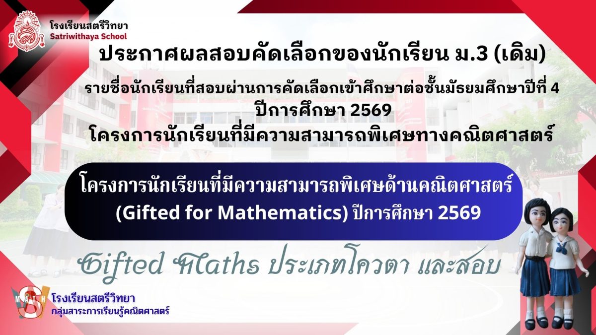 March 24, 2026ประกาศโรงเรียนสตรีวิทยา (ภายใน ม.3 เดิม) เรื่อง รายชื่อนักเรียนที่สอบผ่านการคัดเลือก เข้าศึกษาต่อชั้นมัธยมศึกษาปีที่ 4 ปีการศึกษา 2569